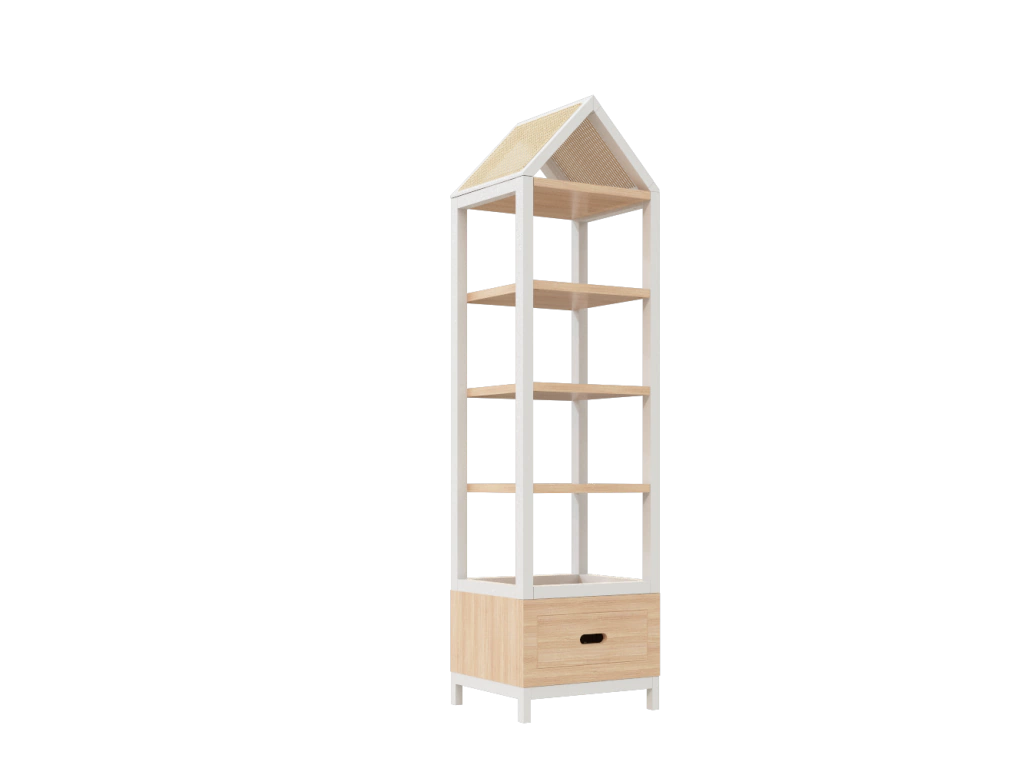 Com design original, a Estante Tupi confere um toque de leveza e praticidade à organização do quarto dos bebes e das crianças.